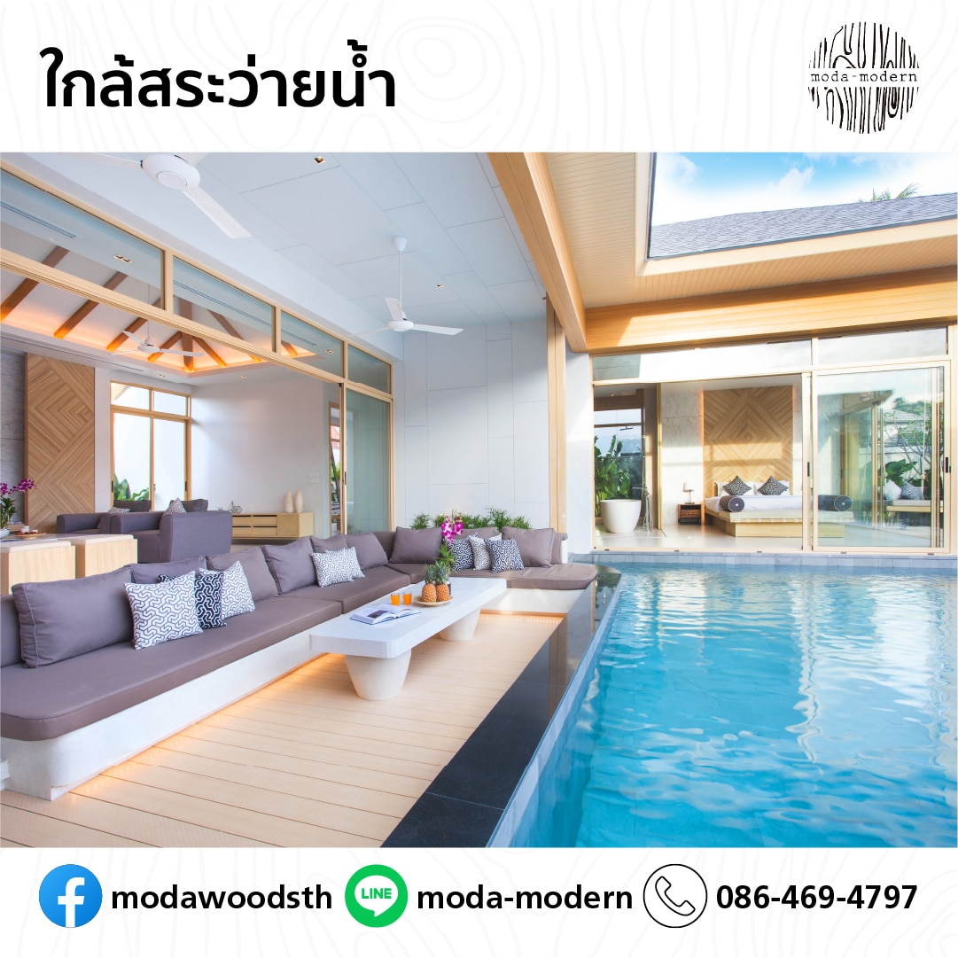 พื้นที่แบบนี้ยิ่งควรต้องระวังเลยค่ะ เนื่องจากบริเวณที่ใกล้กับสระว่ายน้ำจะมีความชื้นที่สูงตลอดเวลาแม้ว่า SPC จะมีคุณสมบัติกันน้ำ แต่ไม่ได้มีคุณสมบัติในการทนความชื้นจึงทำให้ พื้น SPC จะเกิดการบวมได้โดยง่ายค่ะ