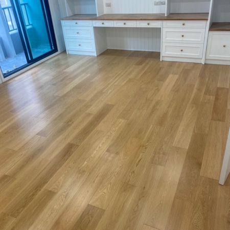 เมื่อตรวจสอบสภาพพื้น, ความชื้น, และระดับชันนูนเรียบร้อย ก็พร้อมติดตั้งพื้นไม้เอ็นจิเนียร์