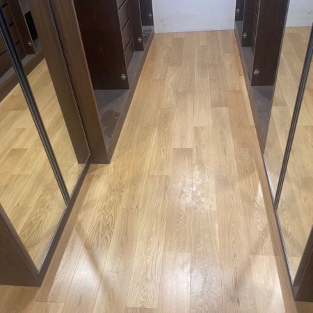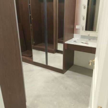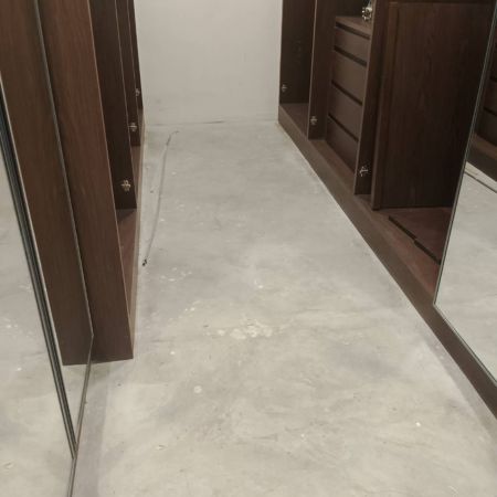 พื้นปูนเป็นลักษณะขัดมันเดิม ผิวเรียบได้ระดับ เตรียมพร้อมสำหรับการติดตั้งพื้นไม้เอ็นจิเนียร์